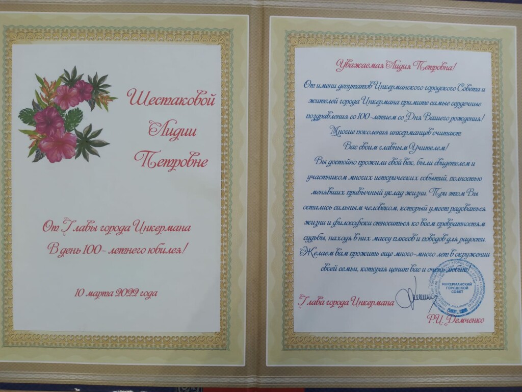 Сегодня, 10 марта 2022 года свой юбилейный 100 день рождения отмечает жительница нашего города, Учитель с большой буквы ШЕСТАКОВА Лидия Петровна! Свой трудовой путь в Севастополе Лидия Петровна начала в 1947 году, в школе рабочей молодежи п. ГРЭС, затем преподавала математику в школе № 10. После открытия в 1962 году новой школы № 12 работала в ней учителем, а затем завучем. Многие ее ученики стали впоследствии учителями школ города Инкермана. С большой любовью и благодарностью свои главным Учителем ее называют Яблонская Марина Валентиновна, Малярова Валентина Васильевна, Масляная Марксина Николаевна. Лидия Петровна до сих пор поддерживает контакты со своими выпускниками 60-70 годов! Ее молодостью духа, оптимизмом можно только восхищаться! С днем рождения Лидию Петровну от имени жителей города Инкермана поздравил Глава Инкермана Демченко Родион Иванович. Уважаемая Лидия Петровна! Желаем прожить Вам еще много - много лет в окружении семьи, которая Вас очень любит и ценит! Хорошего Вам весеннего настроения и множества улыбок! С днем рождения! Со 100- летием!