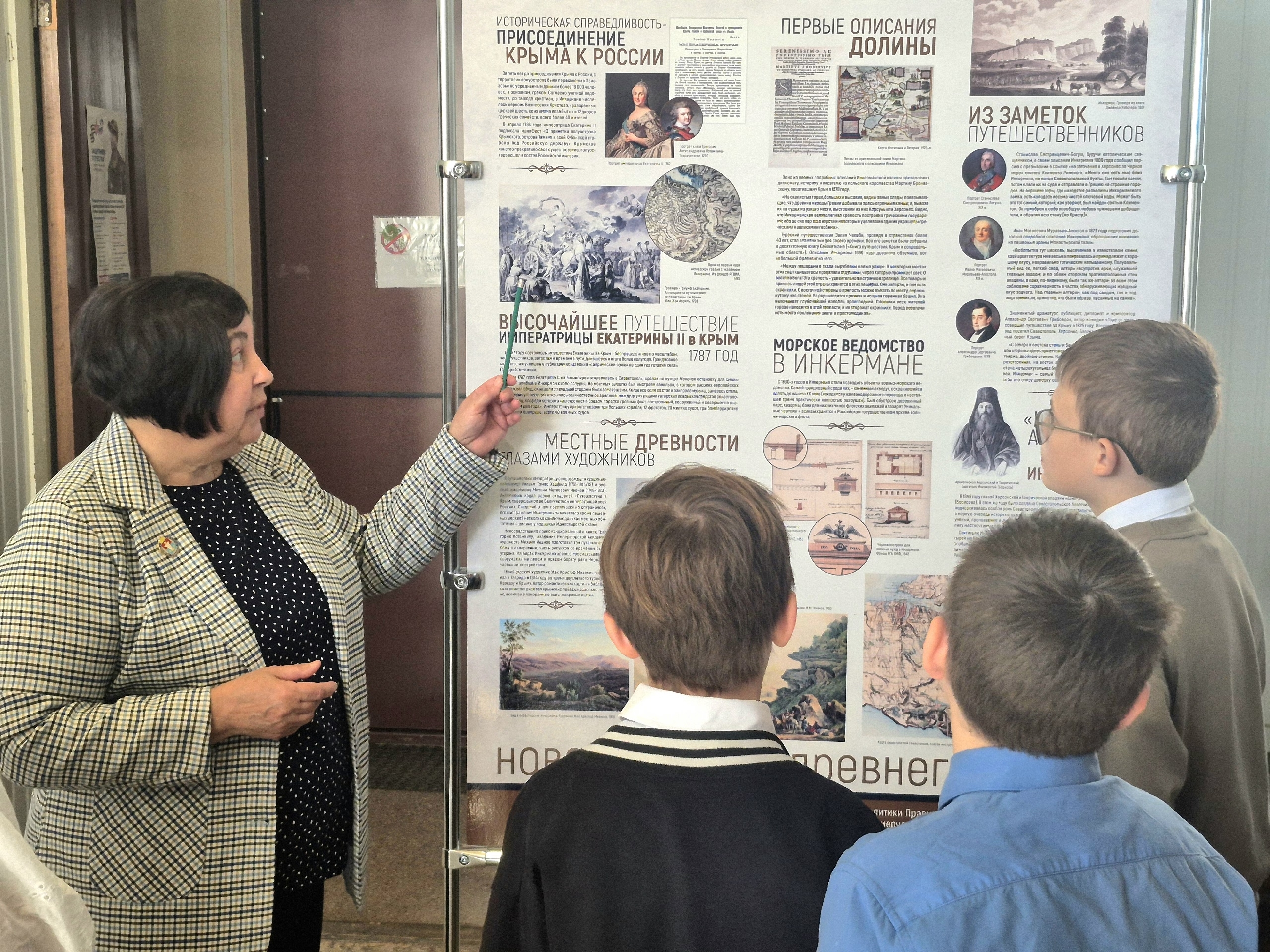 Знакомство с историей проходило по стендам историко-документальной выставки, размещённой в здании администрации. Ирина Владимировна рассказала школьникам об этапах развития Инкермана, его древних корнях, значимых исторических событиях и известных местах города. В ходе экскурсии прозвучали интересные факты об Инкерманской долине, крепости Каламита и Свято-Климентовском монастыре, что вызвало у ребят живой интерес и активное обсуждение.