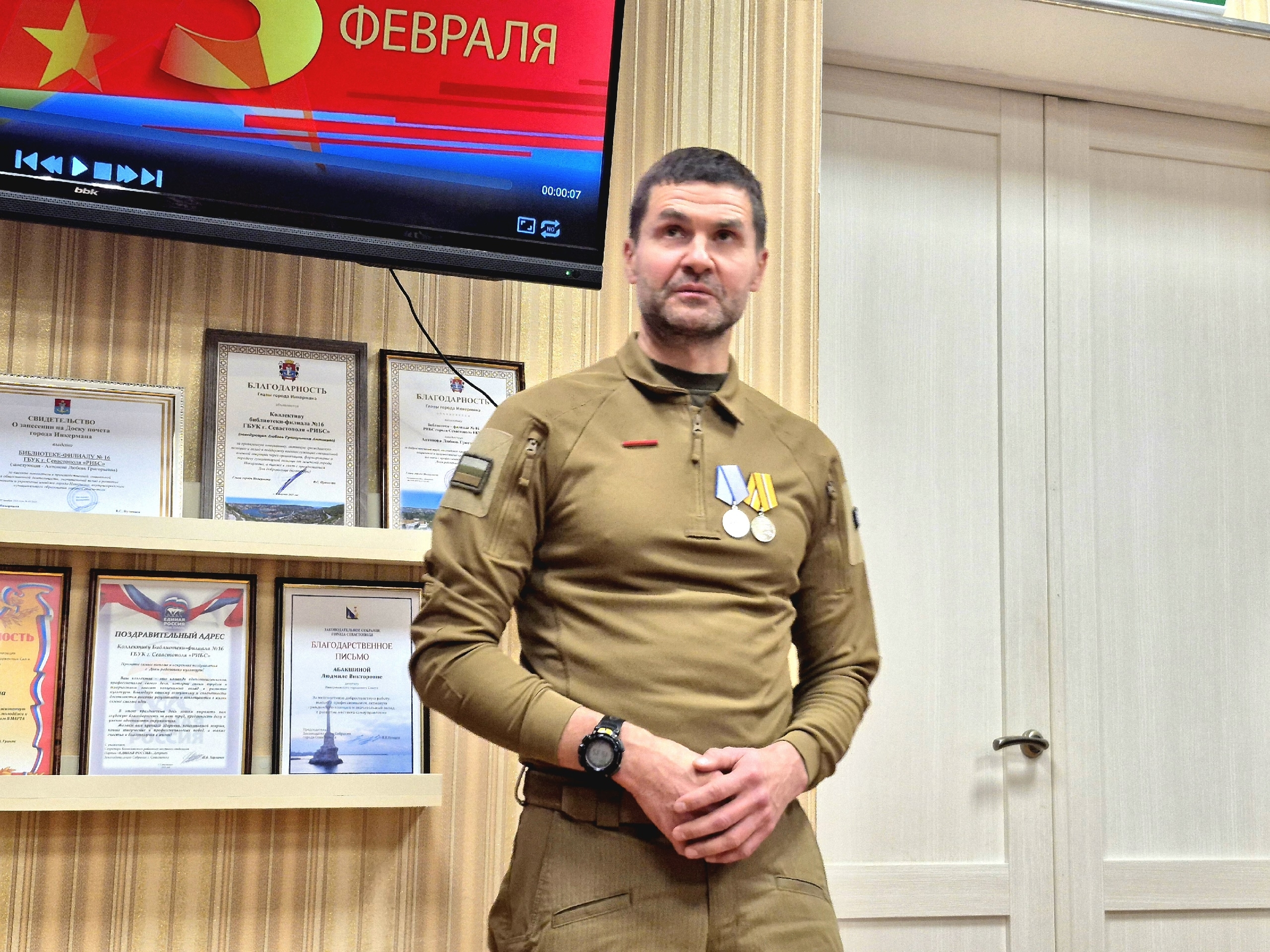 Вечер провела депутат Инкерманского городского Совета, библиотекарь Людмила Викторовна Абакшина. От имени местной администрации города Инкермана к присутствующим обратился помощник главы города Сергей Сергеевич Игнатович. Он поздравил гостей с праздником, подчеркнул значимость воинского служения и выразил слова признательности защитникам Отечества и их семьям.