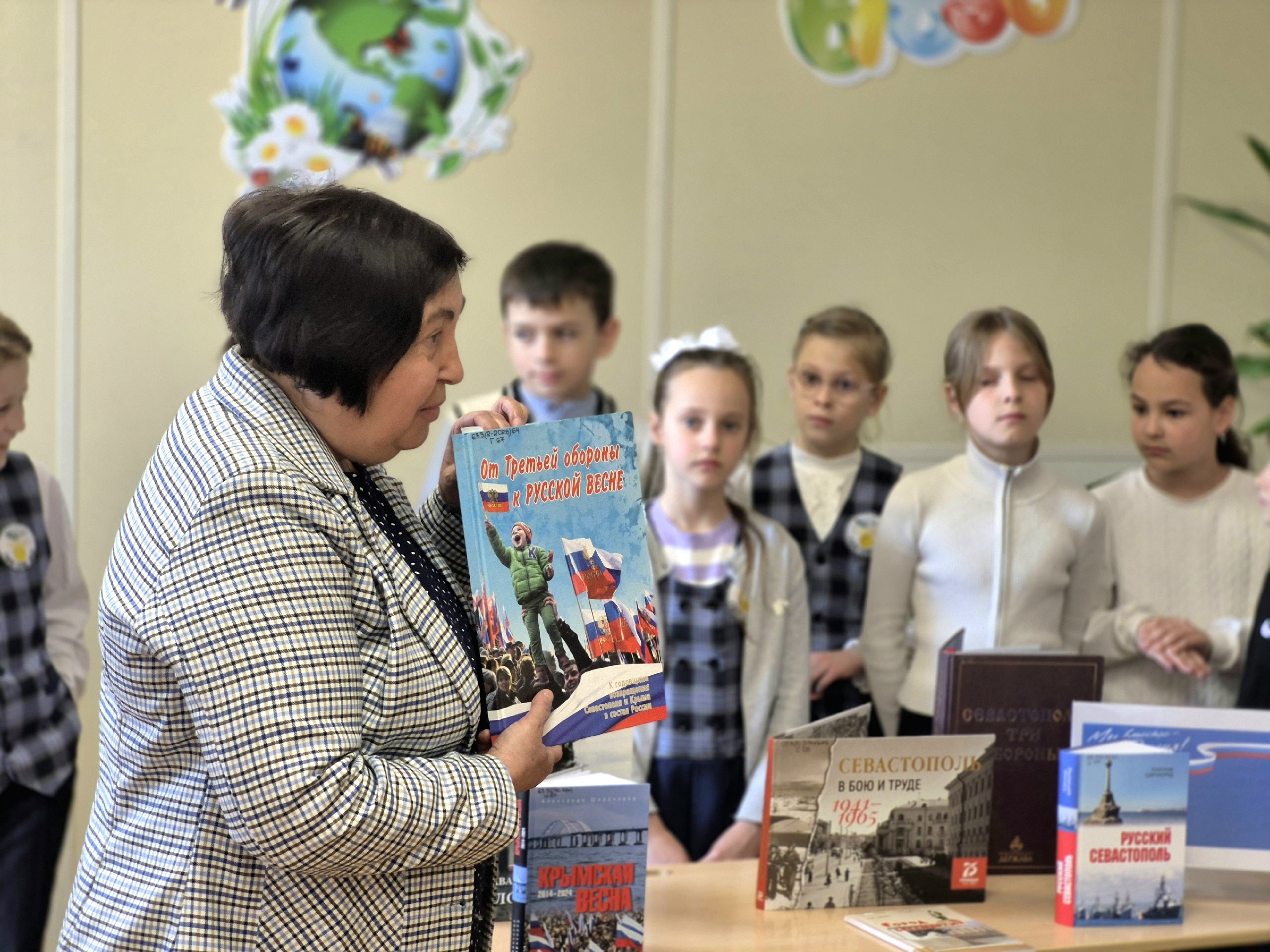 В ходе встречи школьники услышали рассказ об исторических событиях, предшествовавших возвращению Севастополя в Россию. Заведующая детской библиотекой-филиалом №10 Ирина Владимировна Плужник представила тематическую книжную выставку, посвящённую этим событиям.
