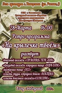 Мелодии 40-х, 80-х, 90-х в исполнении прекрасных коллективов, великолепных солистов! Не пропустите! Вход свободный!"